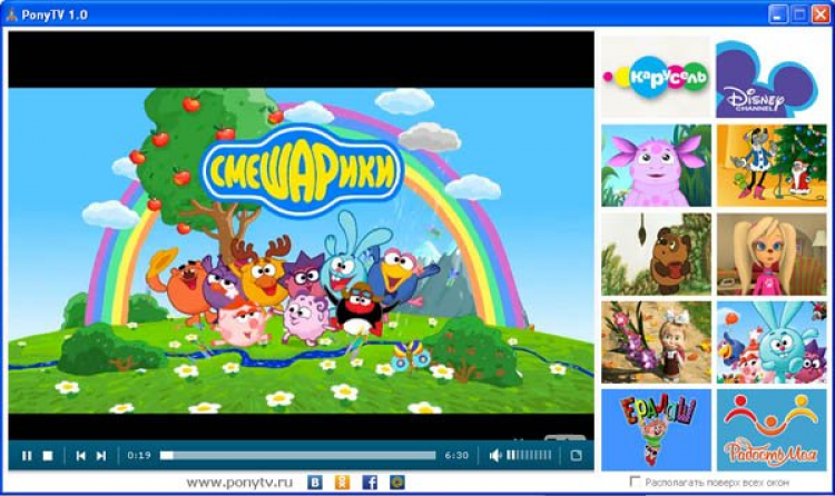 PonyTV - это для всех пап и мам, которые включают своим детишкам мультики на компьютере наша программа будет просто незаменима. Мы постарались собрать все наиболее интересные детские каналы доступные в Интернете, в одном приложении.