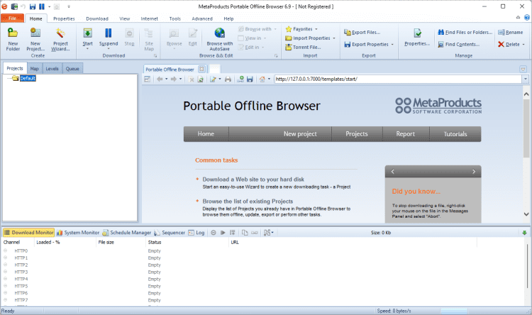 Portable Offline Browser - это оффлайн браузер, способный инсталлироваться и работать на съемном диске (например, flash-накопителе), сохраняя все настройки на диске рядом с собой. Portable Offline Browser поддерживает как закачку обычных Web сайтов, так и FTP, HTTPS серверов, потокового видео/аудио c MMS, RTSP, PNM, NSV (SHOUTcast) серверов.
