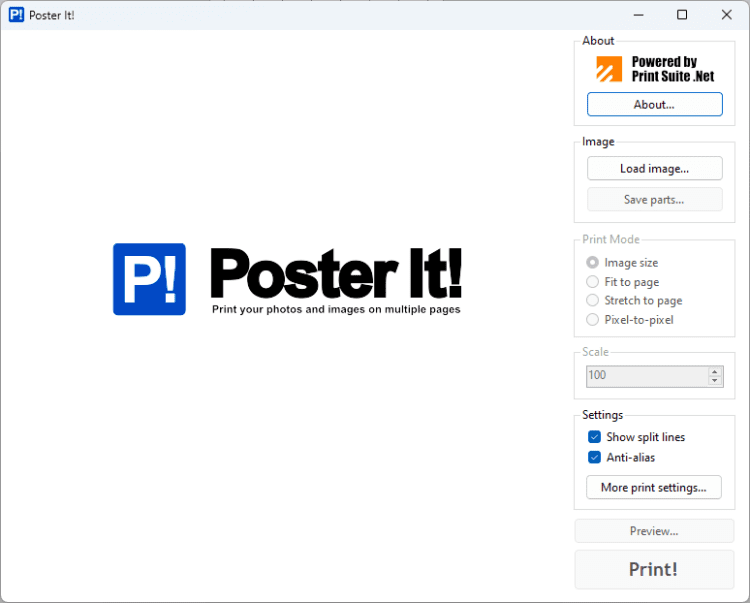 Poster It! — это программа, которая позволяет вам распечатывать рисунки в бОльшем размере, чем позволяет принтер. Программа автоматически разбивает рисунок на части для печати, вы просто выбираете рисунок, размер и настройки, программа распечатывает их сама.