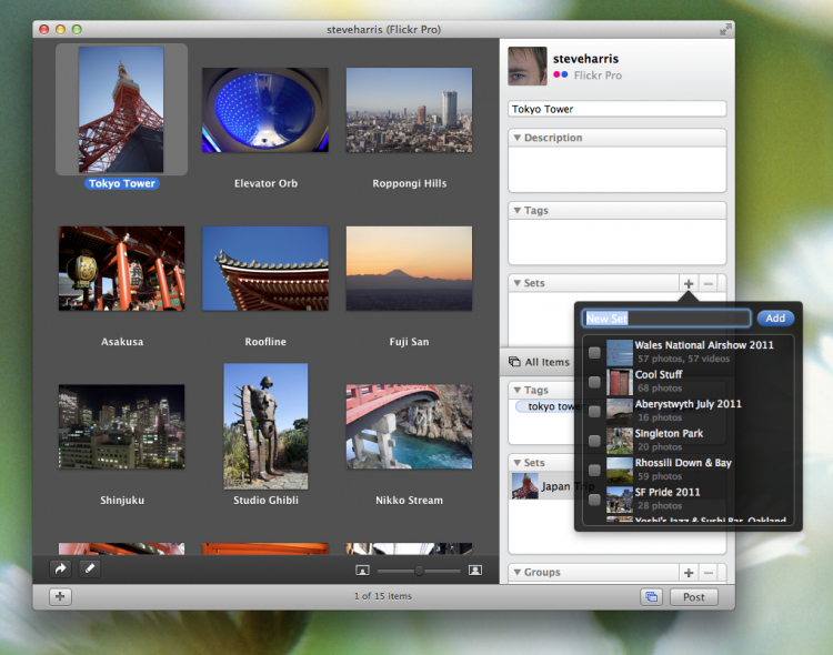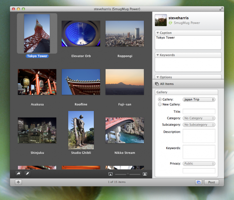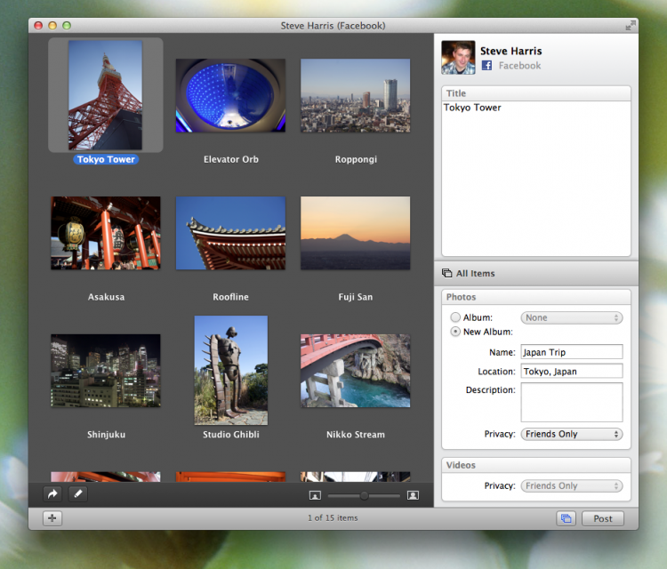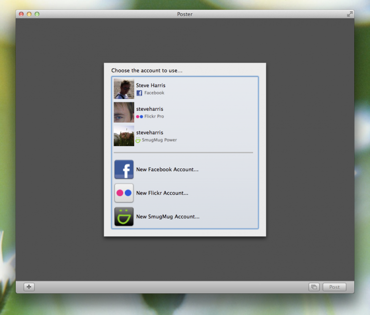 Poster Программа для загрузки фотографий и видео на Flickr, SmugMug или Facebook. Poster обладает красивым и аккуратным интерфейсом, позволяющим пользователям без труда редактировать информацию о контенте. Перед загрузкой, фотографии или видео можно добавить навзвание, описание, приписать тэги, указать в какой набор/папку/группу (если таковые имеются на сайте) их загрузить.