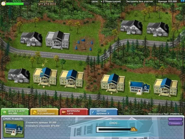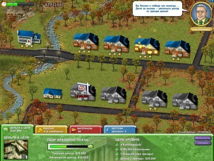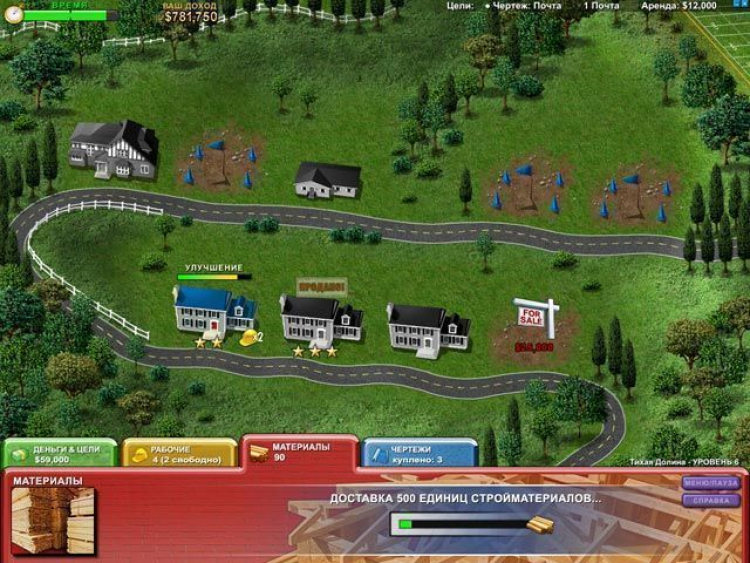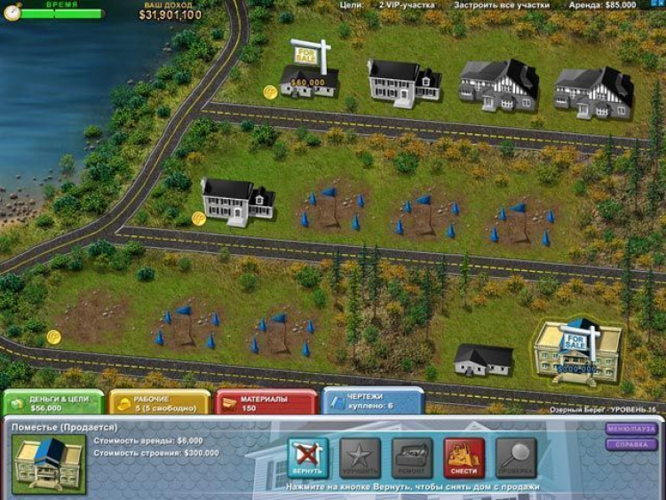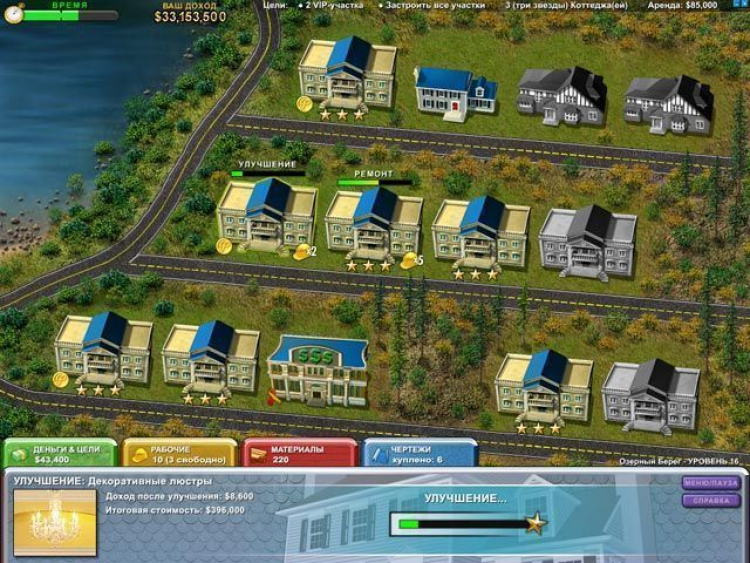Пригодятся вам и вспомогательные здания: они помогут избавиться от налогов, снизить стоимость стройматериалов или удешевят обучение новых рабочих. Помимо всего прочего, дома можно улучшать, сносить, инспектировать, продавать в общем, делать все, что принесет вам дополнительную прибыль. Но получение хорошего дохода еще не гарантирует прохождения уровня за отведенное время. Довольно часто из мэрии будут поступать неожиданные заказы на постройку дополнительных зданий или заработок определенной суммы денег.