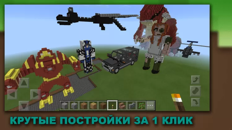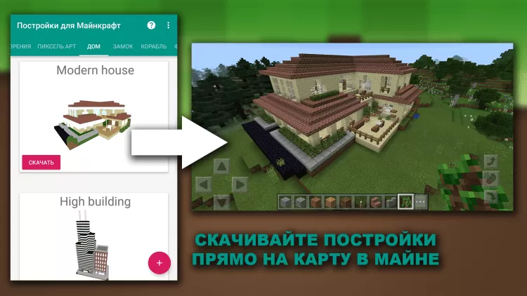 Приложение "Buildings for Minecraft" это удобный каталог самых разных строений для игры Minecraft Pocket Edition. Тысячи уже готовых объектов, которые можно установить в игру в несколько касаний, а так еж регулярное пополнение каталога новыми строениями. Замки, дома, небоскребы, корабли, статуи и многое другое ждут вас - просто выберите место для возведения постройки.