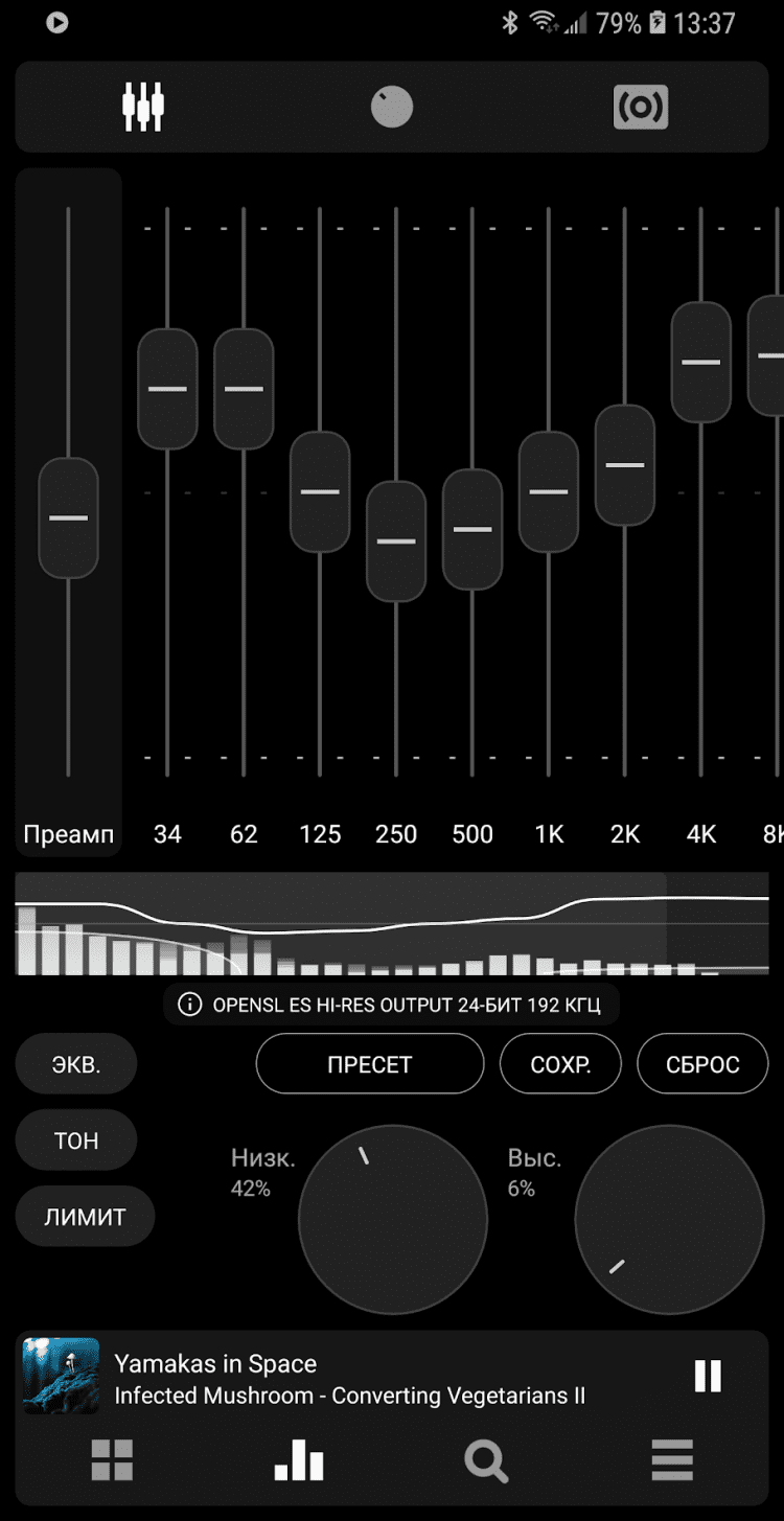- оптимизированный 10-ти полосный граф. эквалайзер для всех форматов, отдельное управление тоном, предустановки (пресеты) эквалайзера, возможность редактирования и добавления пресетов, назначение для песен/аудио-выходов;
