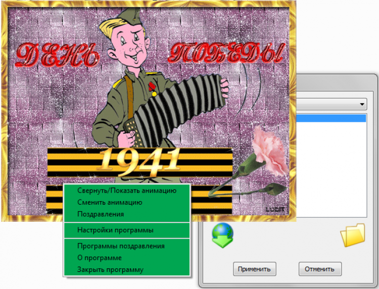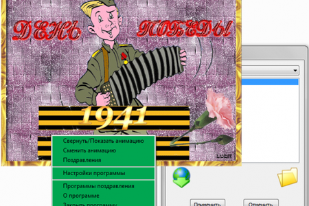 Программа содержит в себе красивые открытки и анимации на рабочий стол. С данной программой вы легко подберете нужное поздравление с 1 мая и Днем Победы.