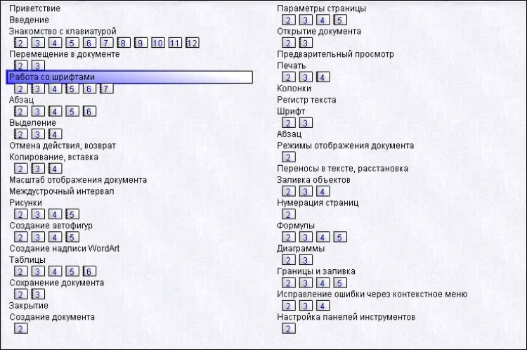 В каждом разделе имеются задания, которые можно выполнять как в программе, так и в Word. Самые важные и сложные моменты отображены в виде анимированных клипов. В клипах хорошо видно, какие действия необходимо выполнить, чтобы добиться результата, а также где и когда следует нажимать клавишу или кнопку мыши. Приведено подробное описание для каждого действия.