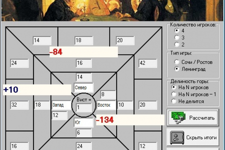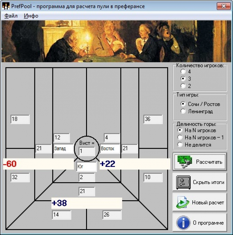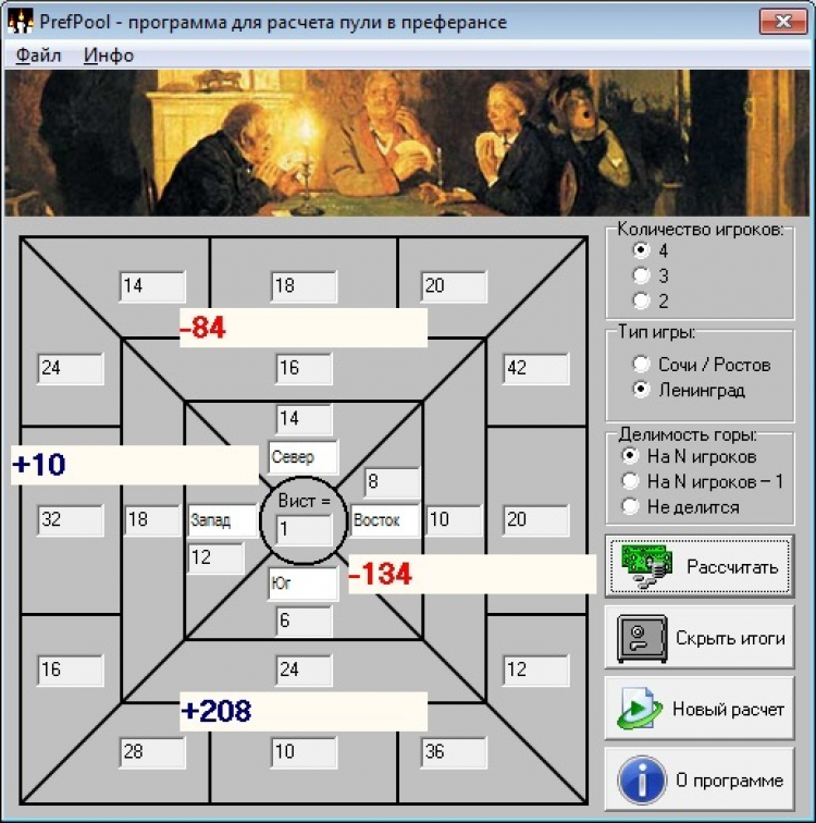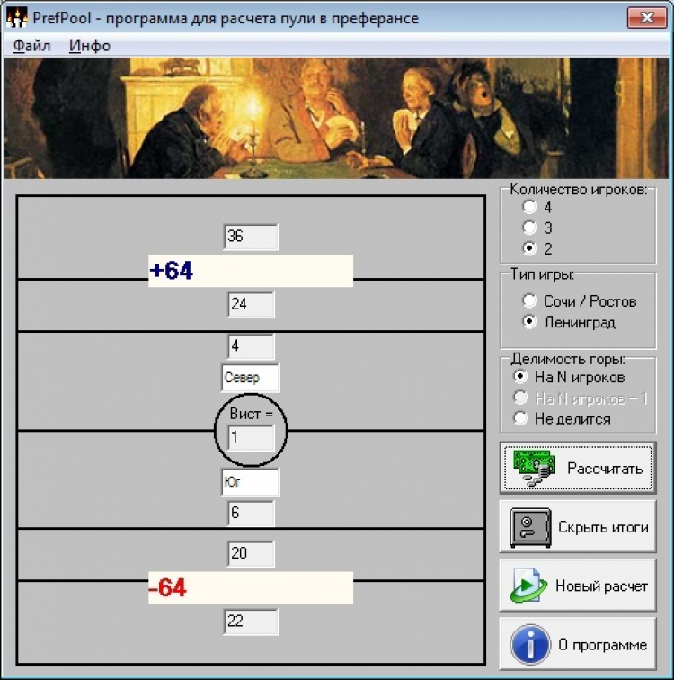 PrefPool - это программа подсчитывает выигрыш или проигрыш каждого игрока на основе конечных результатов пули при игре в преферанс. При этом имеется возможность установить количество игроков (от 2-х до 4-х), тип игры (сочинка/ростовка, ленинградка) и делимость горы (на количество участников пули, на N - 1, без деления). Расчет производится с учетом рекомендаций Кодекса преферанса, согласно которому в случае возникновения дробных частей итоговых сумм делаются поправки в горе и вистах игроков для того, чтобы деление шло без остатка. P. S. В случае когда при четырех игроках и делимости горы на N минус один в результате деления гор на 3 образуются остатки более чем у двух игроков, в целях оптимизации расчета в гору каждого игрока добавляется либо списывается 1 очко (что не влияет на итоговый результат), после чего устанавливается, какому игроку (либо каким двум игрокам) необходимо сделать поправку к горе с соответствующей компенсацией в вистах.