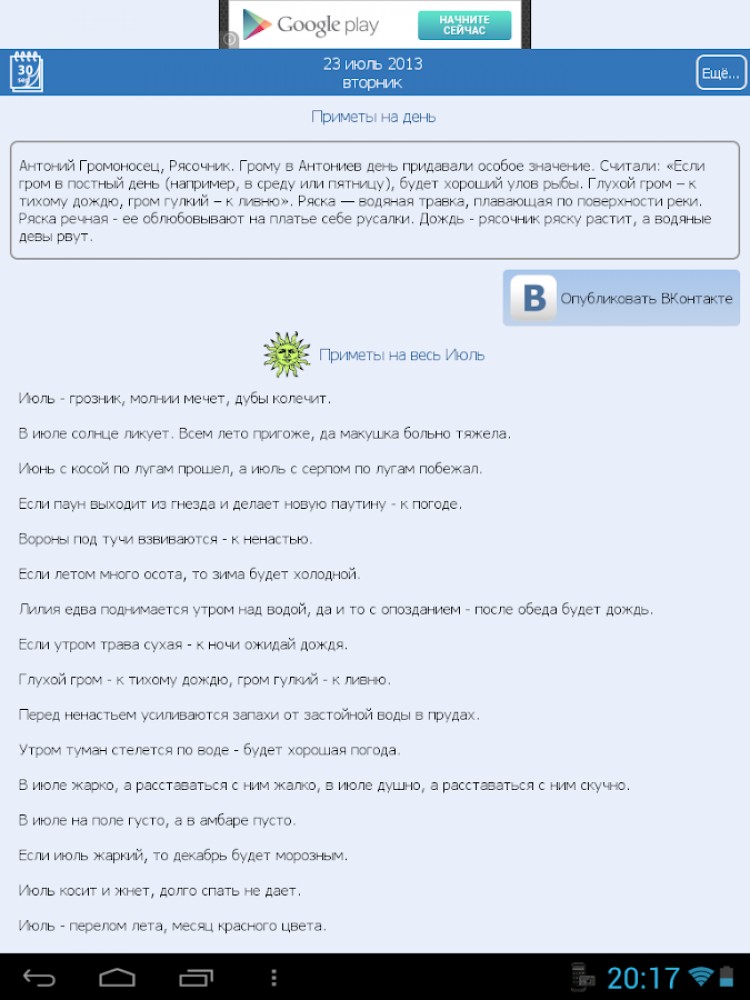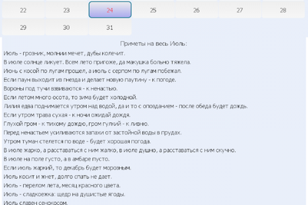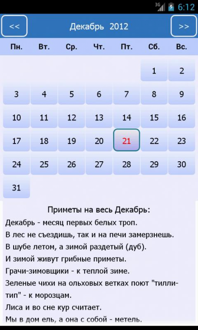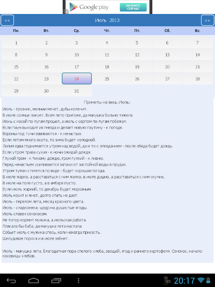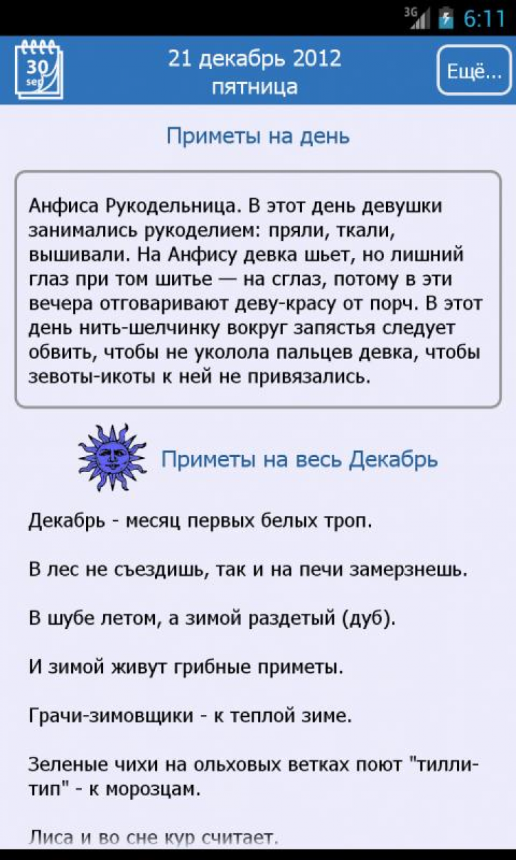 Приметы Народные праздники и приметы на каждый день на экране вашего мобильного устройства. Календарь примет, приметы на весь месяц. Все даты даны по новому стилю. Русский народный календарь примет наших бабушек имеет свою давнюю историю и свой русский быт, связанный с земледелием и особенностями русской природы в нашей стране. Основанные на боле чем тысячелетнем опыте наблюдений, изначально являли собой важнейшую информацию для наших предков. Неся в себе как прикладную функцию, приметы также являются старейшим памятником русского языка. Своей самобытностью, отражая живой и красочный мир нашего фольклора.