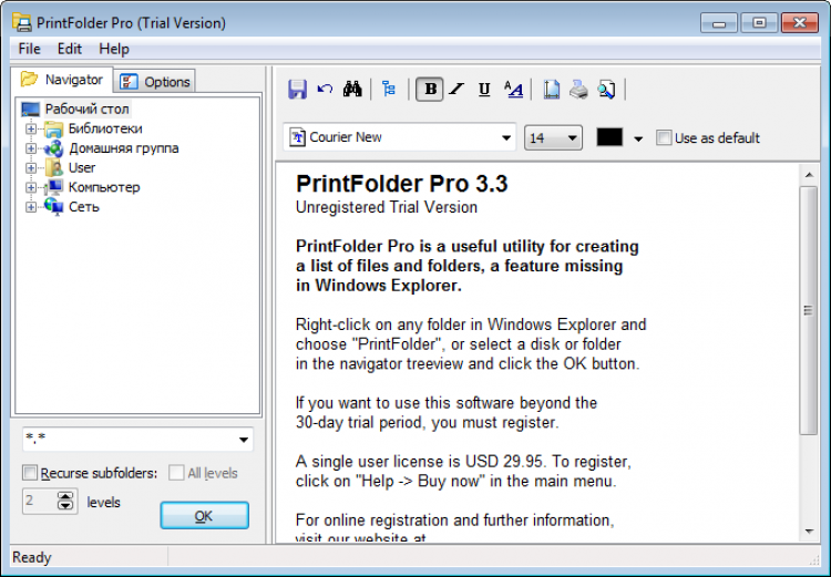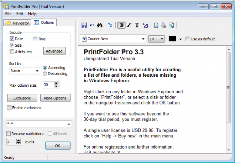 \PrintFolder Pro обладает интуитивно понятным интерфейсом и проста в использовании. Она позволяет выбрать любую папку на жестком диске и сразу увидеть ее содержимое. Перед печатью список файлов можно отформатировать выбрать шрифт, стиль, цвет и другие параметры. Кроме этого, PrintFolder Pro может сохранить список файлов в текстовый или HTML файла, или разделенный список.
