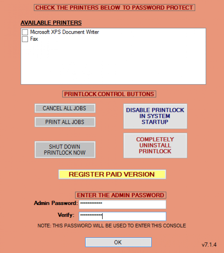 PrintLock Позволяет установить пароль на принтер в целях экономии чернил и бумаги. Она может пригодиться в небольших организациях, где принтер находится в свободном доступе. С ее помощью можно ограничить доступ к нему для посторонних лиц. Установите PrintLock на компьютер, выберите принтер(ы), к которому вы хотите ограничить доступ и установить свой пароль. При попытке распечатать что-либо на таком принтере, выскочит с требованием ввести правильный пароль. Из дополнительных особенностей PrintLock можно отметить возможность отмены или запуск всех заданий печати. Никаких дополнительных настроек программа не требует. Рекомендуем скачать PrintLock с FreeSoft.ru: это бесплатно, безопасно и быстро!
