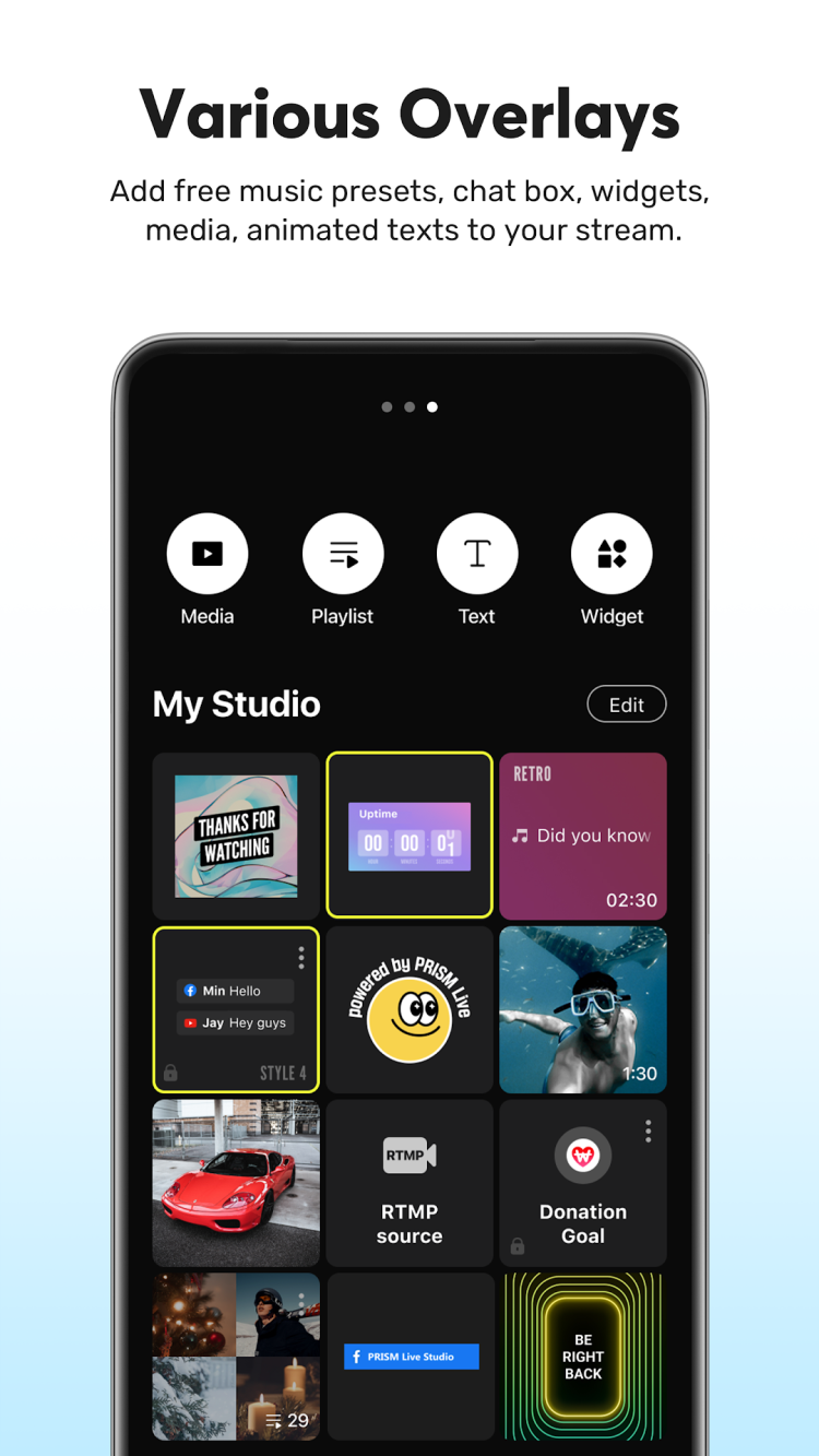 Начните трансляцию видео с вашего Android-гаджета, добавляя музыку, всевозможные маски или наклейки в режиме реального времени, чтобы улучшить впечатления зрителей. Вы также можете добавить веб-виджет, чтобы облегчить получение донатов или общение с вашими подписчиками, благодаря встроенному виджету чата. Загрузите последнюю версию приложения PRISM Live для Android с нашего сайта и воспользуйтесь его богатым функционалом, совершенно бесплатно.