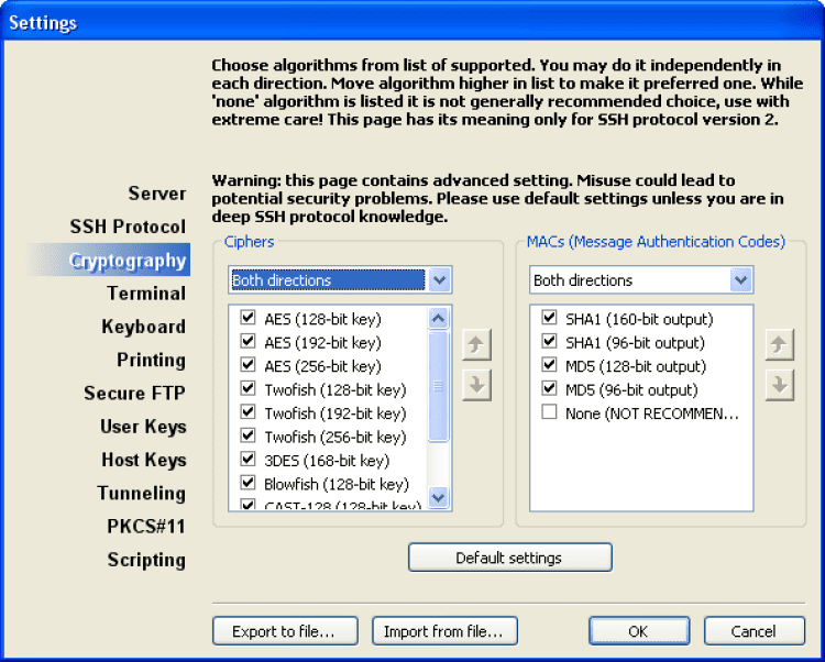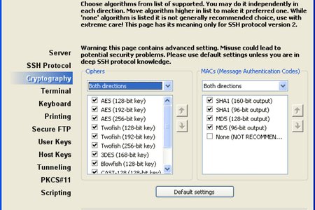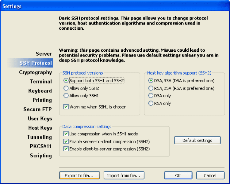 Полная поддержка SSH1 и SSH2. Изначальные настройки позволяет подключиться практически к любому SSH серверу наиболее безопасным способом, если же Ваш сервер настроен по-особенному, то Вы можете изменить практически любые настройки протокола SSH в Private Shell.