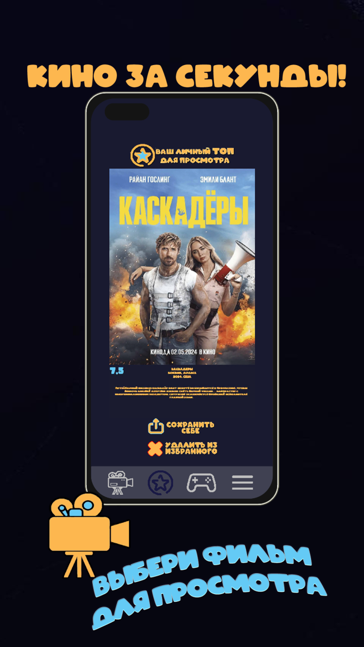 - Избранное в 1 тап — сохраняй любимые фильмы с анимацией подтверждения.
