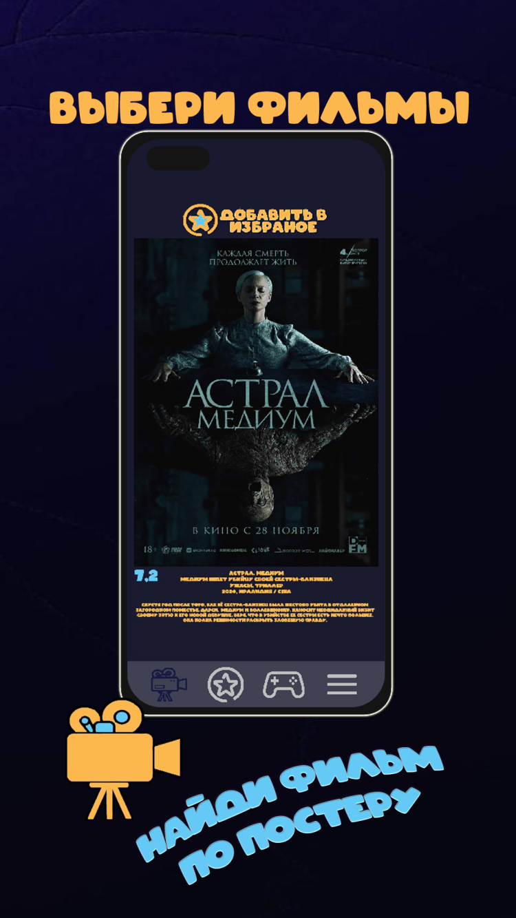 - Листай постеры — тап вправо для нового фильма, влево для возврата.