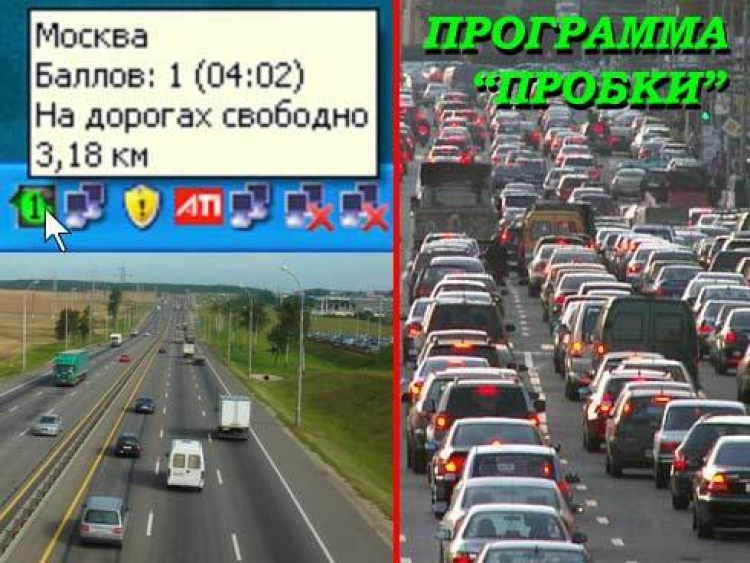 ПРОБКИ - это программа опрашивает сервер Яндекса, который содержит постоянную точную информацию о пробках. И в удобном виде, в виде небольшой иконки с изображением светофорчика, в правом нижнем углу экрана - выводит общие данные о пробках по десятибальной шкале. При этом при низком уровне пробок - светофорчик светится зелёным, при умеренном уровне - жёлтым, а при большом уровне пробок - красным светом. программа может загружаться вместе с компьютером, и Вы всегда видите уровень пробок в течение всего дня.