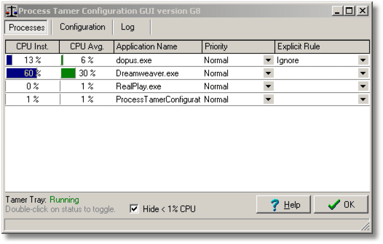 Process Tamer - это маленькая, но очень полезная утилита для ос семейства Windows, которая сидит в трее и наблюдает за загруженностью процессора, если какой-нибудь процесс перегружает процессор, то программа понижает ему приоритет, в результате система всегда находится в рабочем состоянии.