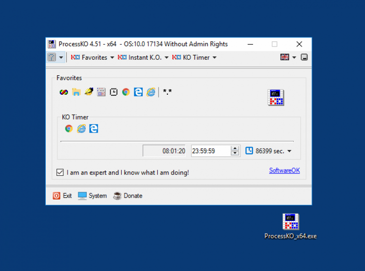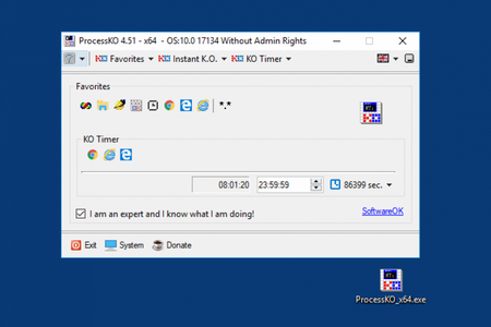 В специальном выпадающем списке главного окна ProcessKO отображаются все запущенные процессы. Любой из них может быть остановлен всего в один клик. Программа обладает функцией установки таймера отключения процессов и добавления наиболее часто зависающих программ в список избранного для ускорения их завершения.