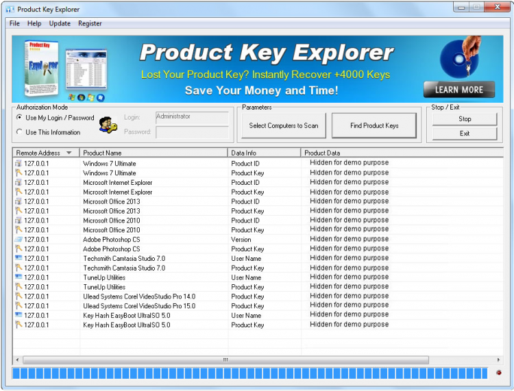 Product Key Explorer - это программа для надежного хранения лицензионных ключей программного обеспечения, установленного на компьютере. После установки программа проведет сканирование компьютера для обнаружения установленного ПО, затем составить его список.