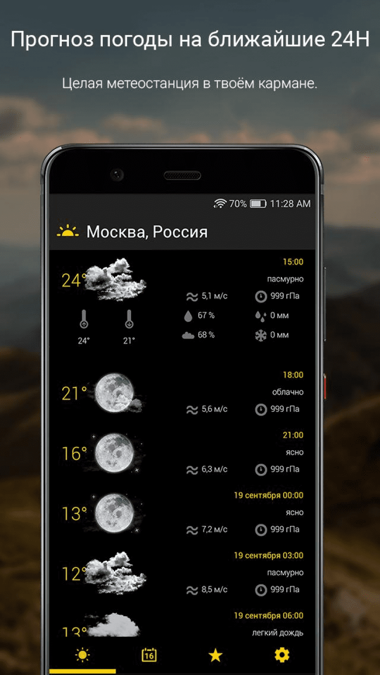 Прогноз погоды на 16 дней Приложение, с помощью которого вы всегда будете в курсе погодных условий в России. Актуальная информация о погоде всегда будет на экране вашего мобильного устройства, благодаря удобному встроенному виджету. Программа позволяет знать информацию о текущих погодных условиях, увидеть местные и краткосрочные прогнозы, или просмотреть итоговый и подробный прогноз.