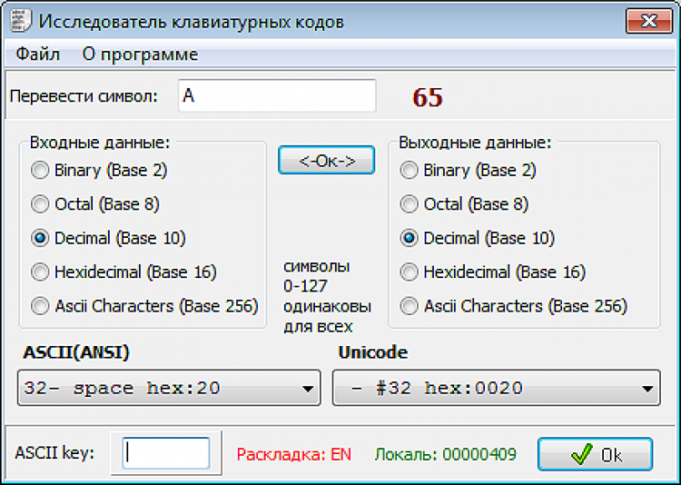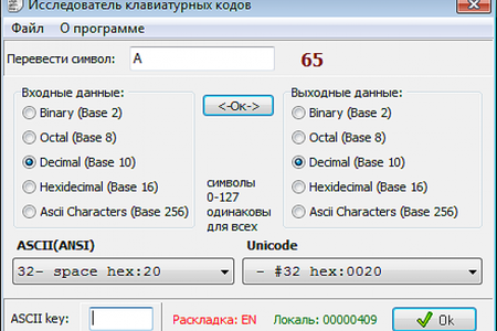 Программа - исследователь клавиатурных кодов: "ASCIIcode" - это программа предназначена для определения ASCII кодов клавиш компьютера. Программа так же содержит таблицы клавиш ASCII (ANSI) и Unicode, а так же позволяет переводить клавиатурные символы в другие единицы исчисления.