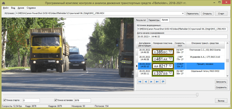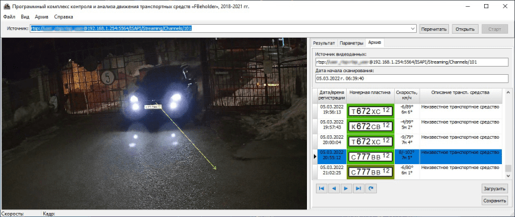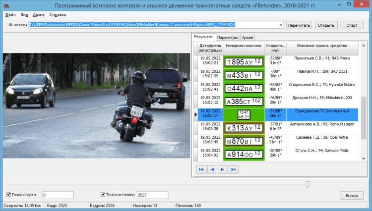 Программа «FBeholder», предназначена для контроля перемещения транспортных средств на участке дороги в режиме реального времени по видеопотоку или в отложенном режиме по видеофайлу с возможностью распознавания государственных регистрационных знаков, управления внешними устройствами через сетевые реле, определения скорости, дистанции и вектора направления движения транспортных средств.