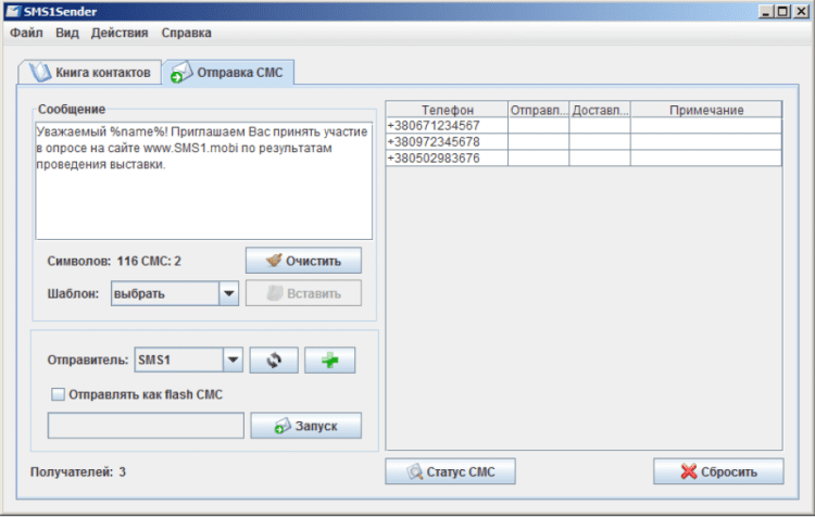 Программа смс - это программа для отправки смс с компьютера через Интернет. Осуществляет массовую рассылку смс, подмену номера смс, отправку смс по шаблону, контроль доставки смс. Программа отправляет смс через Интернет напрямую в смс шлюзы операторов сотовой связи. Это позволяет мгновенно доставлять смс с компьютера пользователя на телефоны.