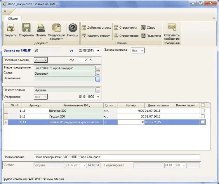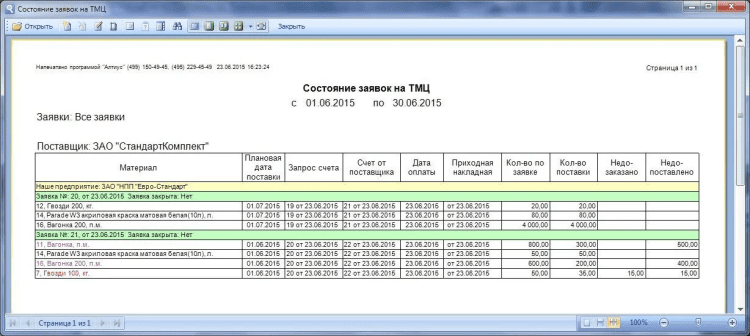 - контролировать состояние заявки на ТМЦ вплоть до конкретной позиции (поступление на склад, ожидание поставки и так далее).