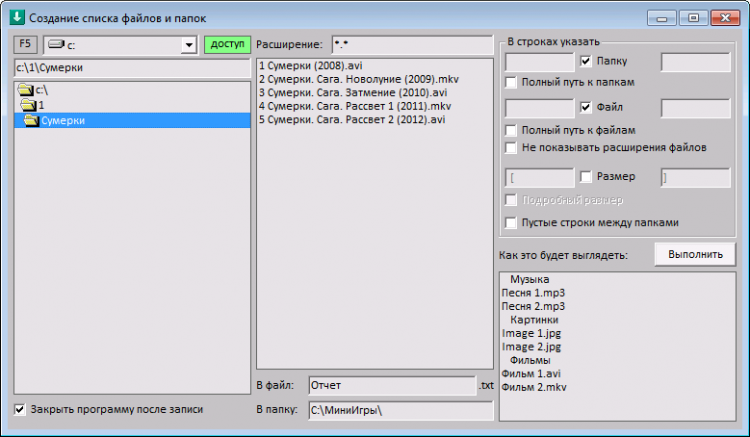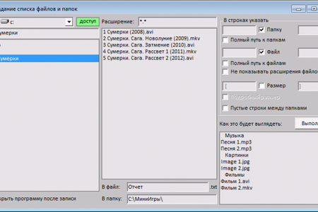 В настройках можно выбрать, что именно записать. Названия папок, названия файлов, полные пути к ним, размеры файлов. Правая нижняя часть окна программы покажет, как именно произойдет запись. Можно указать сетевой путь, но при работе с файлами в сети может возникнуть ошибка, связанная с максимальной длиной пути к файлу, зависящая от системы.