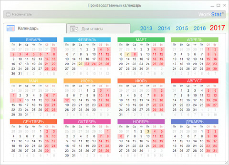 Производственный календарь - это полезная программа, которая отображает все рабочие, выходные и праздничные дни в соответствие с действующим законодательством и принятым Постановлениями Правительства РФ «О переносе выходных и праздничных дней в 2017 году». Позволяет рассчитать нормы рабочего времени при 40, 36 и 24-часовой неделе, определить количество рабочих и выходных дней в конкретном месяце или квартале.
