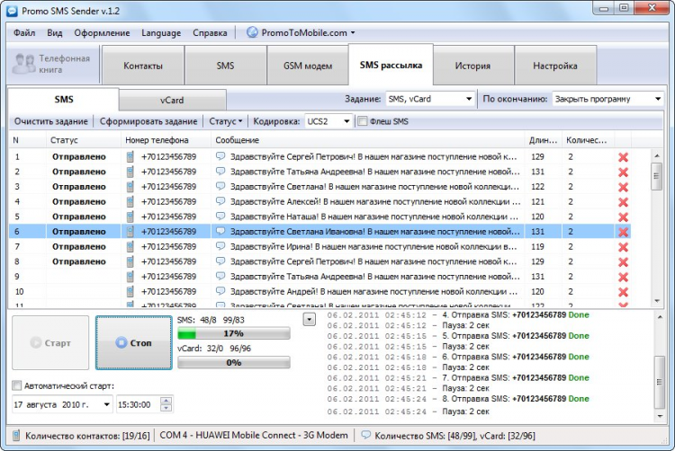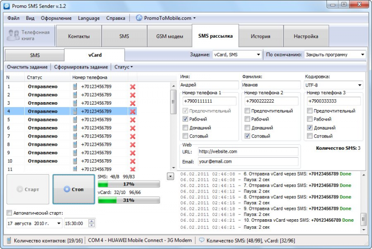 Promo SMS Sender - это программа позволит организовать автоматическую массовую SMS рассылку с вашего компьютера используя USB GSM модем или сотовый GSM телефон, подключенный через USB, COM, Bluetooth. Также программа умеет рассылать бизнес-карточки vCard через SMS. Адресная книга позволит вам группировать контакты для SMS рассылок.