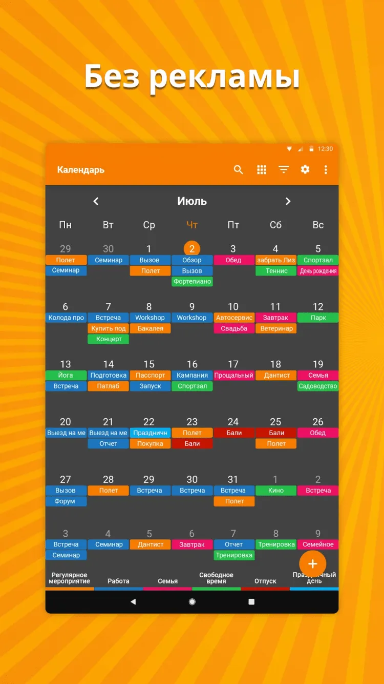 - выделение рабочих, личных и прочих событий на календаре, разными цветами;