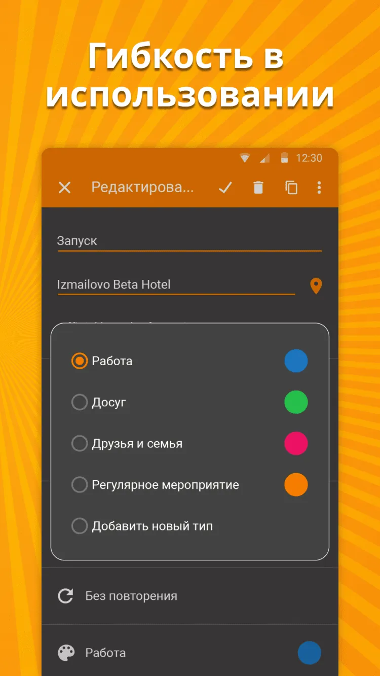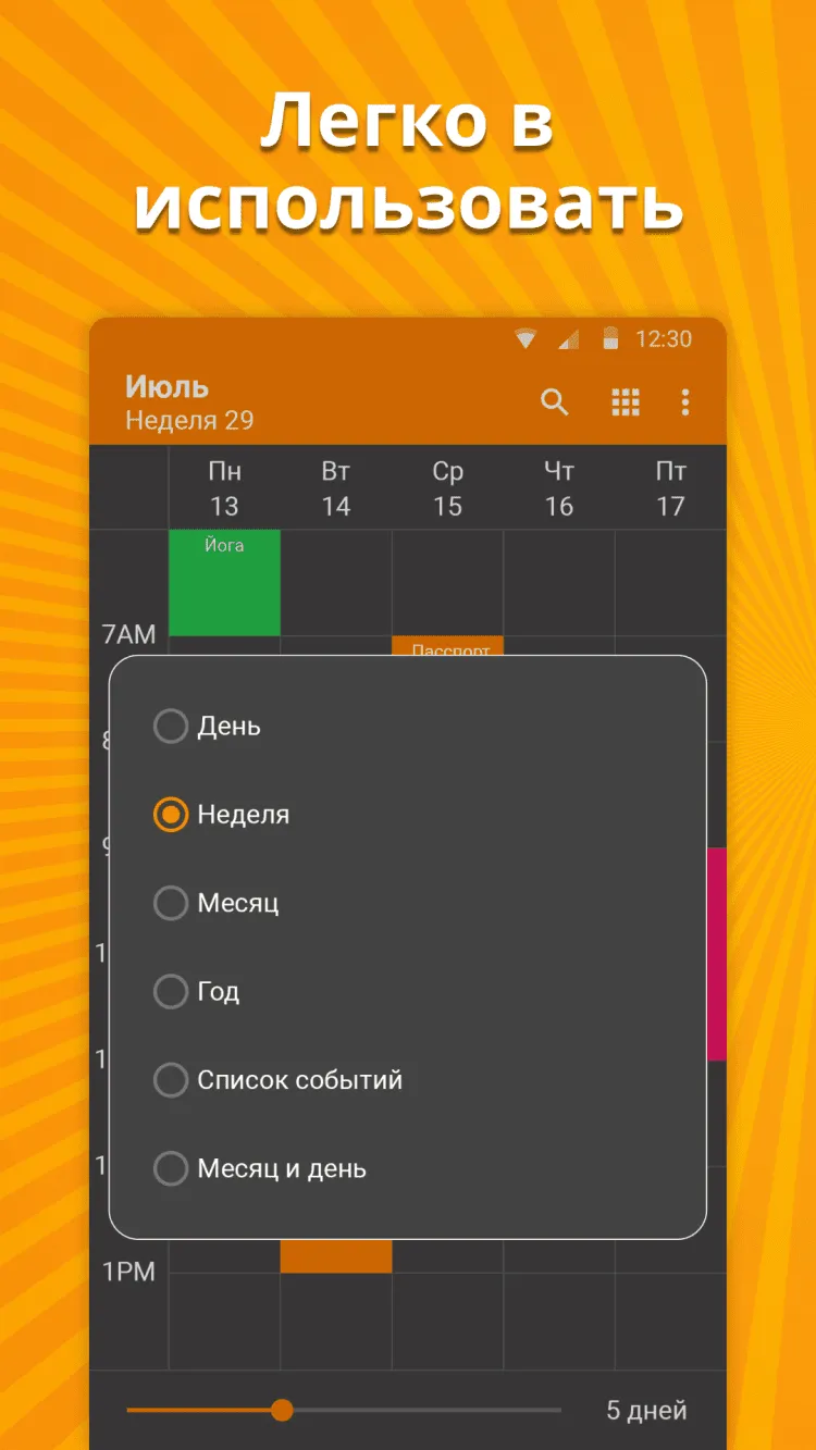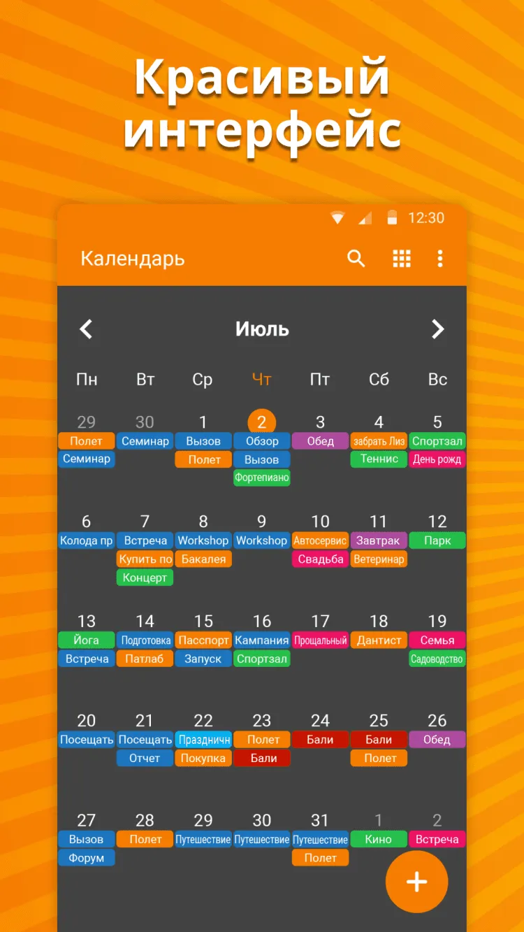 Перед вами простой, гибко настраиваемый календарь с функцией распределения задач по их типу. Другими словами, вы можете отделить личные дела от рабочих, отмечая их на календаре разными цветами. Отметив все запланированные события на календаре, вы сможете точнее оценить свою нагрузку и спланировать свое расписание. Все задачи всегда будут у вас под рукой: просто откройте календарь и нажмите на нужное событие, чтобы получить дополнительную информацию о нем. А встроенный планировщик с функцией напоминания о событиях, будет напоминать о приближающихся сохраненных событиях, чтобы вы не забыли ничего важного.