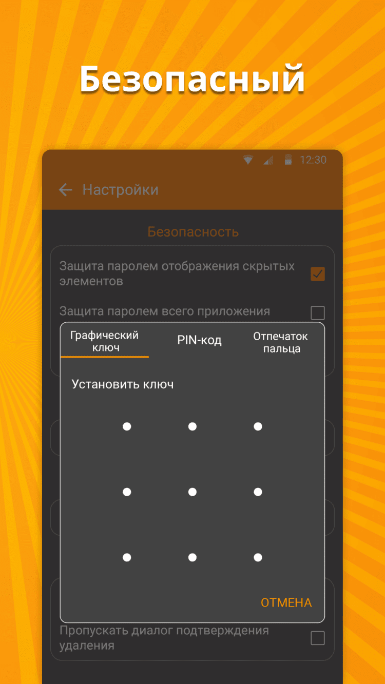 - защита входа в приложение при помощи графического ключа, сканера отпечатков пальцев или PIN-кода;