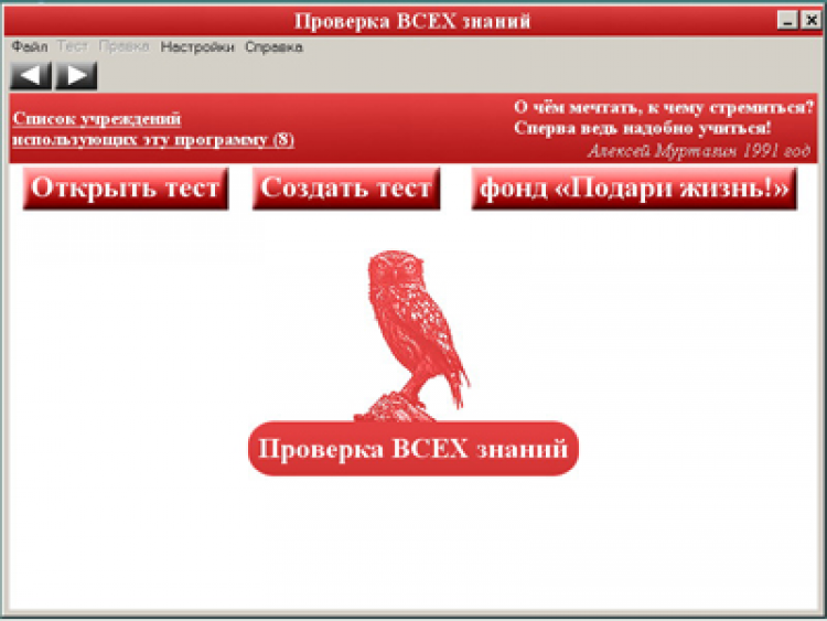 Проверка ВСЕХ знаний - это бесплатный редактор тестов для проверки или получения знаний в любой сфере человеческой деятельности, а также для выявления психологических особенностей характера. Рекомендуется: всем учебным заведениям, частным лицам, и фирмам, желающим проверить квалификацию персонала.