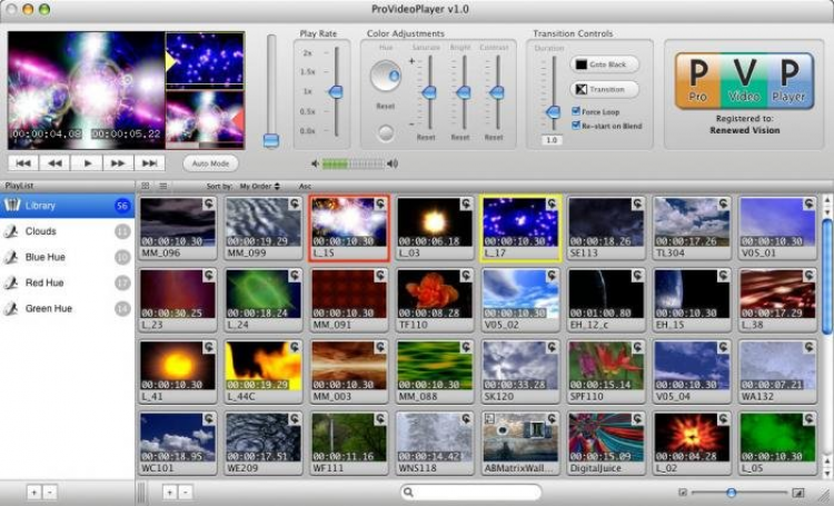 ProVideoPlayer Видео плеер, предназначенный для проигрывания роликов на различных развлекательных и других мероприятиях. С его помощью вы сможете организовывать видео для показа, создавать несколько плейлистов для разных мероприятий, изменять цвет, скорость и параметры вопроизведения видео. В ProVideoPlayer вы можете настроить эффекты перехода от одного видео к другому и переключать их автоматически или вручную.