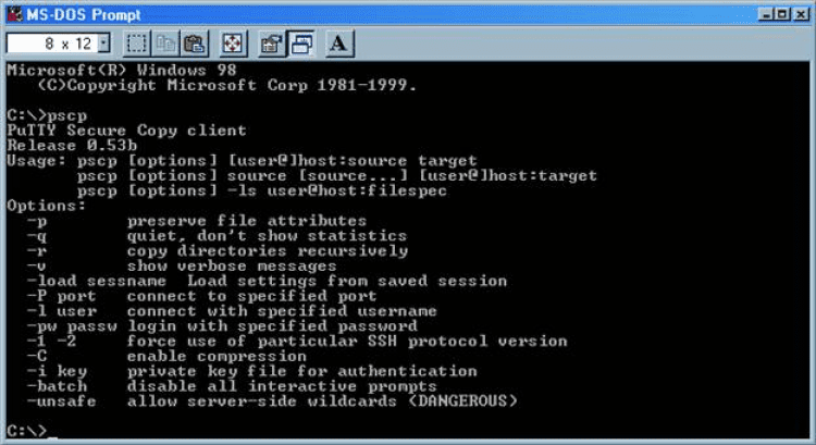 PSCP SCP (от англ. secure copy) — протокол RCP копирования файлов, использующий в качестве транспорта не RSH, а SSH. PSCP - это клиент для SCP, являющийся частью PuTTY. Позволяет выполнять безопасное копирование файлов.