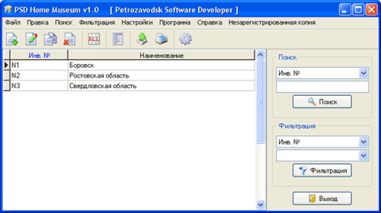 PSD Home Museum - это программа специально создавалась для частных коллекционеров и небольших провинциальных музеев. Она позволяет вести "упрощенную" главную инвентарную книгу в электронном виде. Для работы не обязательно заполнять все поля, достаточно будет указать Инвентарный № и Наименование экспоната.
