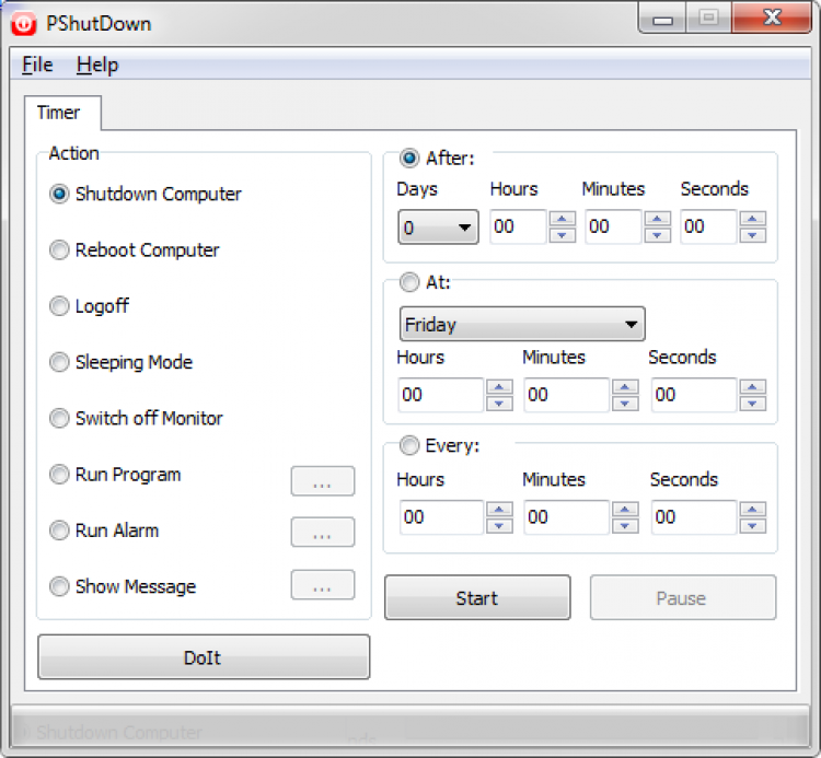 PShutDown Это программа, с помощью которой можно составлять расписание для автоматического выключения компьютера, или выполнения другого действия. Действие может выполняться по истечении заданного времени, в указанный день и время или с определенным интервалом.
