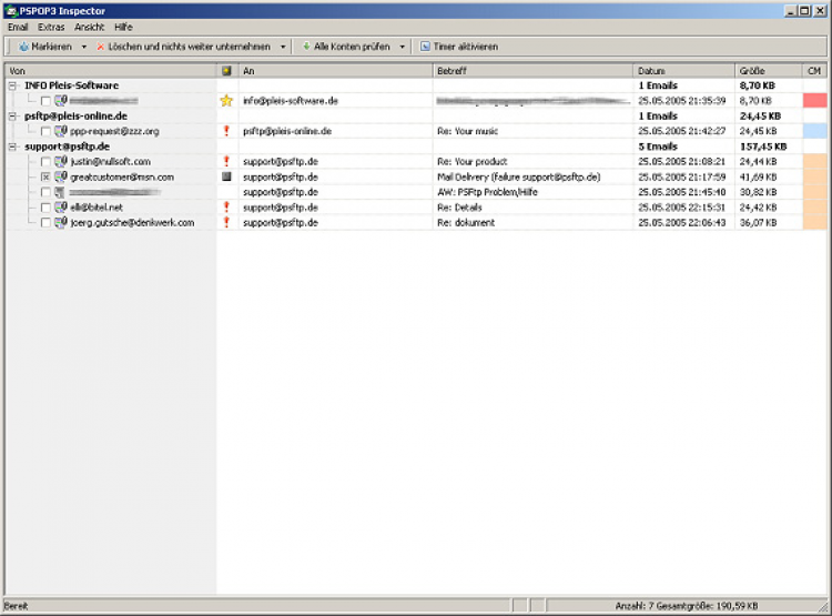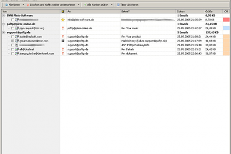 PSPOP3 Inspector - это программа для проверки POP3 аккаунтов электронной почты. Реализована поддержка RFC-1225, RFC-1734, RFC-1939, RFC-2449, RFC-2595. Поддерживает SSL/TLS соединения (Explicit and Implicit modes). --- PSPOP3 Inspector предоставляет возможность предварительного просмотра POP3 аккаунтов так же как и возможность удаления плохих сообщений прямо на сервере.