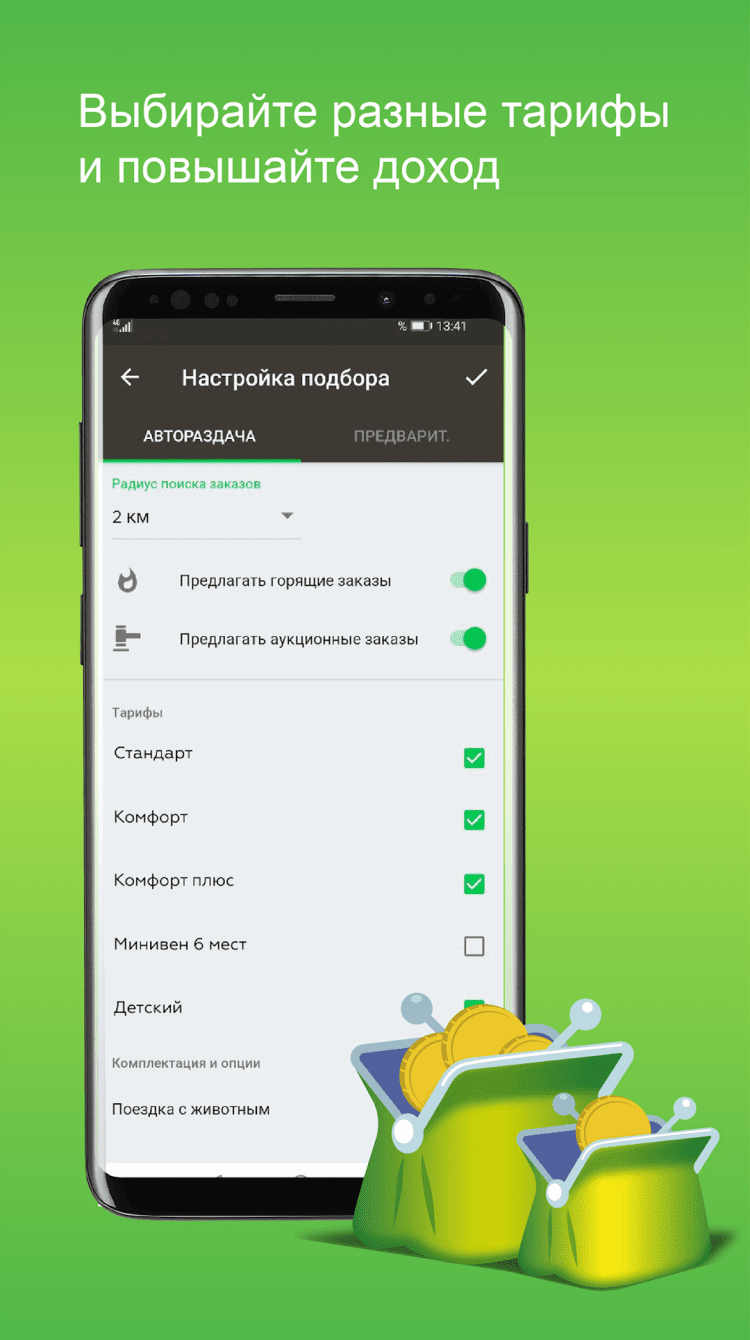 - функция "Аукцион" позволяет принять предложенную пассажиром стоимость поездки, либо озвучить собственную;