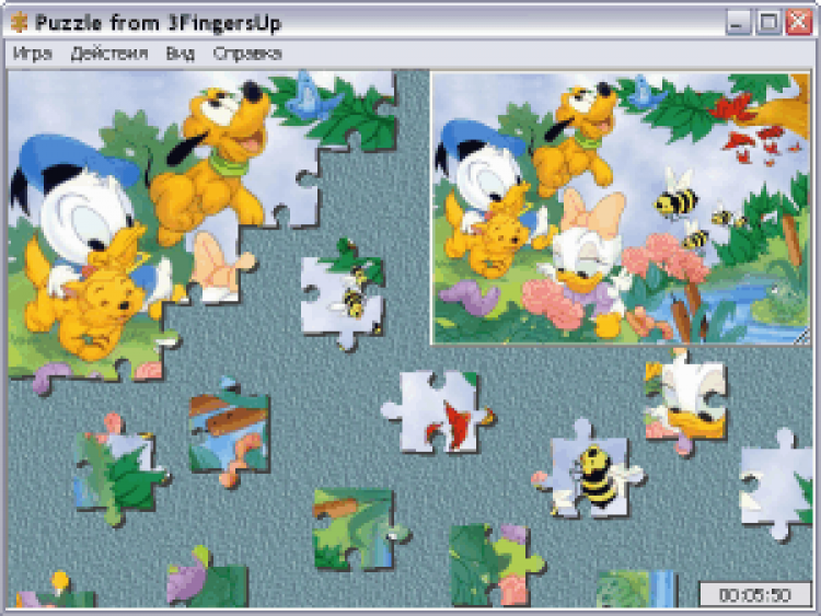 Puzzle from 3FingersUp - это игра, в которой надо собрать разрезанную на части картинку. Картинка загружается из любого BMP, JPEG или PNG файла. Размер, количество фрагментов, а также их форма (классическая, восьмиугольник, квадрат) задаются пользователем. Элементы поворачиваются. Можно перетаскивать, поворачивать и объединять друг с другом блоки элементов. Предусмотрена возможность сохранения / загрузки игры.