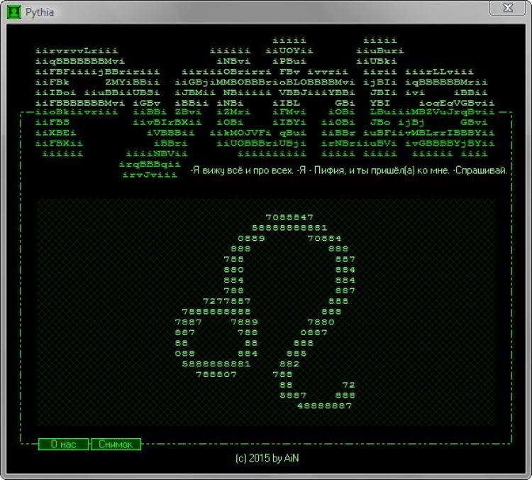 Pythia - это программа прорицательница. Пифия - в Древней Греции жрица-прорицательница Дельфийского оракула. В свое время к ней приходило огромное количество людей услышать вещие слова. Жителе со всех уголков Греции навещали знаменитую прорицательницу. Даже могучий полководец Александр Македонский был искушен славой Пифии и посещал ее, что бы послушать о будущем. Пифия произносила чаще всего бессвязные слова, которые облекались дельфийскими жрецами в форму прорицаний, переставлялись и толковались жрецами и передавались затем в неясных, туманных или двусмысленных выражениях.