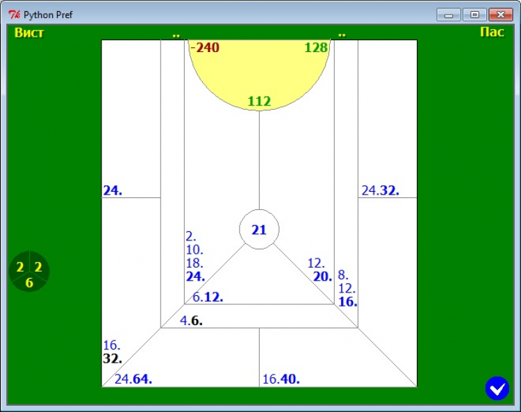 Python Pref (PyPref) - это программа для игры в преферанс, написанная на языке Python. Позволяет играть в сочинку, ленинградку и ростовку, а также настраивать общераспространенные конвенции игры. Исходный код приложения основан на алгоритмах kpref Азарного И. В. и OpenPref. Программа распространяется по лицензии GNU GPL.