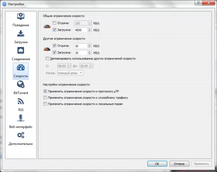 - Регулирование скорости скачивания/загрузки торрентов.