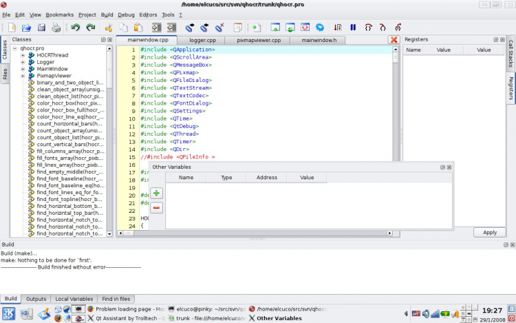 - Обозреватель классов, позволяющий программисту просматривать структуру классов, членов и функций. Также обозреватель объектов GUI позволяет быстро создать необходимую функцию (например, для нажатия кнопки) и объявить ее в классе.