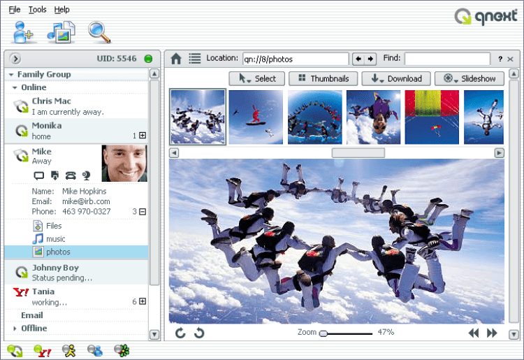 Qnext - это программа, позволяющая передавать любые файлы, как напрямую, так и в режиме FTP, организовывать музыкальные зоны и фото-зоны. Имеет функции чата и электронной почты.