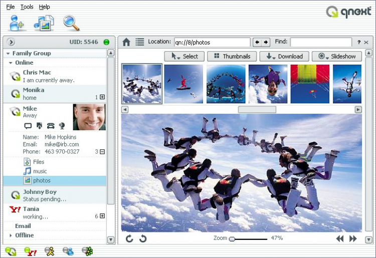 Qnext Программа, позволяющая передавать любые файлы, как напрямую, так и в режиме FTP, организовывать музыкальные зоны и фото-зоны. Имеет функции чата и электронной почты.