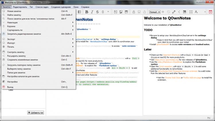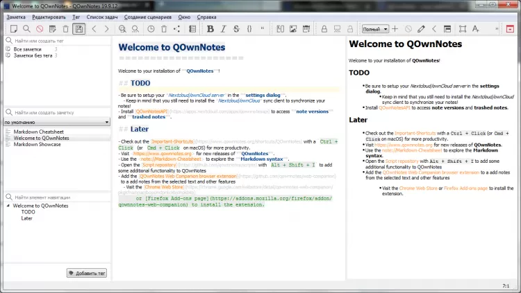Используя эту программу вы можете записывать свои мысли, идеи, планы и т.д. Записи хранятся в простых текстовых файлах. Есть возможность синхронизации заметок между разными компьютерами посредством облачных хранилищ ownCloud, Nextcloud, Dropbox и пр. Программа имеет удобный, приятный интерфейс.