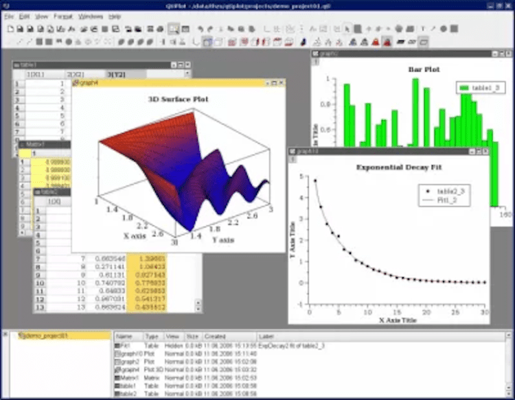 QtiPlot Программное обеспечение для анализа и визуализации научных данных. QtiPlot может использоваться для создания 2D и 3D графиков и содержит большое количество функций для анализа данных, таких как аппроксимация кривых и т. п. При построении 3D-графиков рендеринг может производиться с использованием OpenGL при помощи библиотеки Qwt3D.