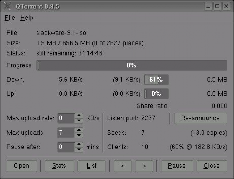 QTorrent BitTorrent клиент для ОС Linux, обладающий неплохим набором функций. QTorrent позволяет открывать для каждого торента отдельное окно или просматривать торенты в видео списка. Для каждого отдельного торента можно устанавливать скорость загрузки/отдачи и т.д. Так же в программе имеется отдельная страница с подробной статистикой по всем торентам.