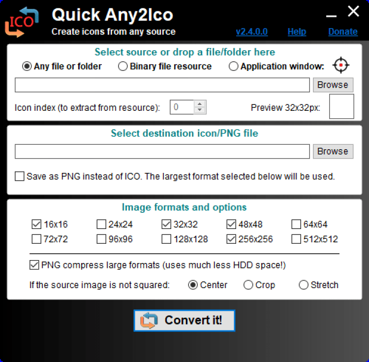 Quick Any2Ico - это приложение, которое позволяет пользователям извлекать иконки из разных форматов, и конвертировать в PNG или GIF формат с разным разрешением.